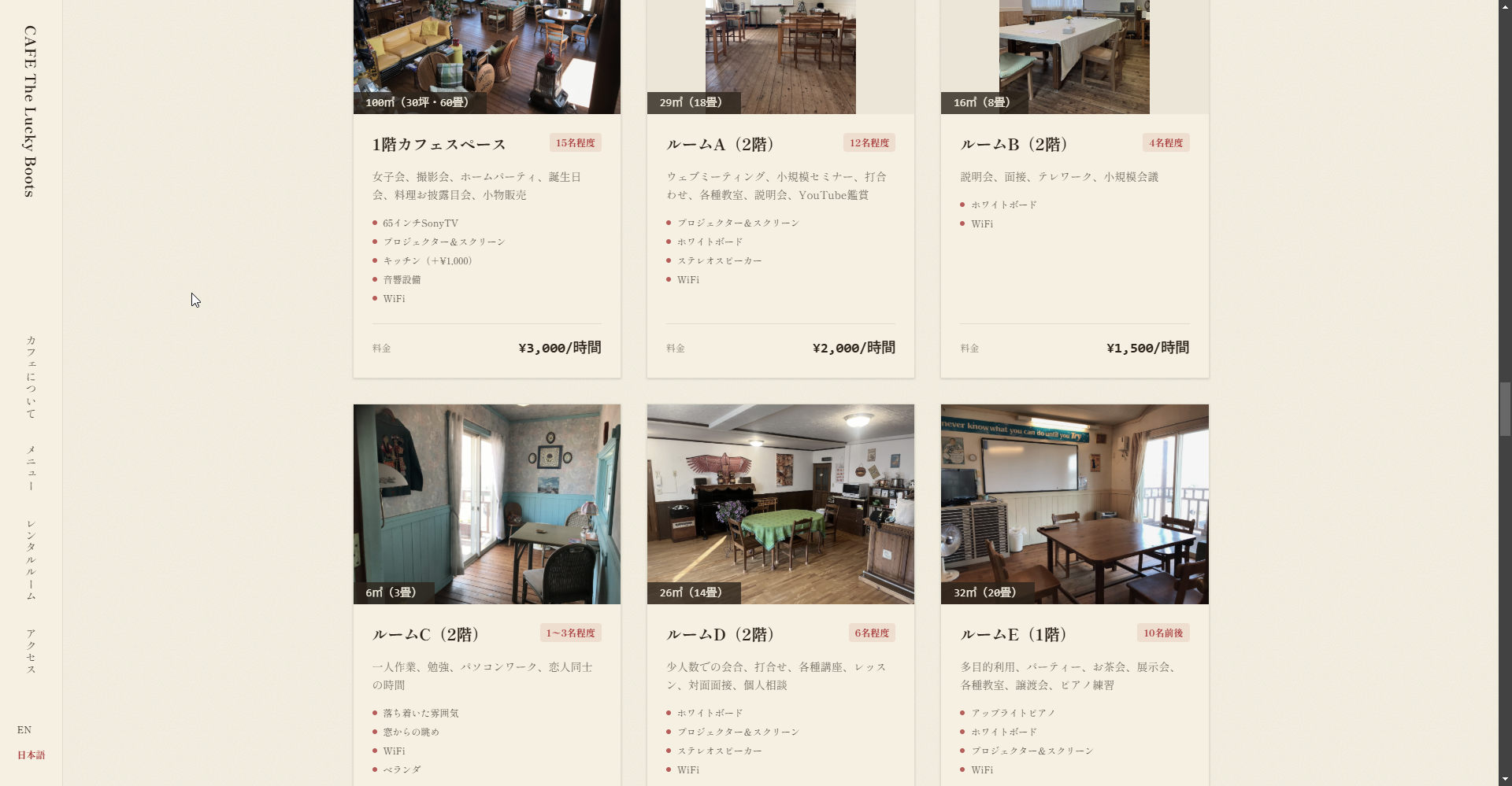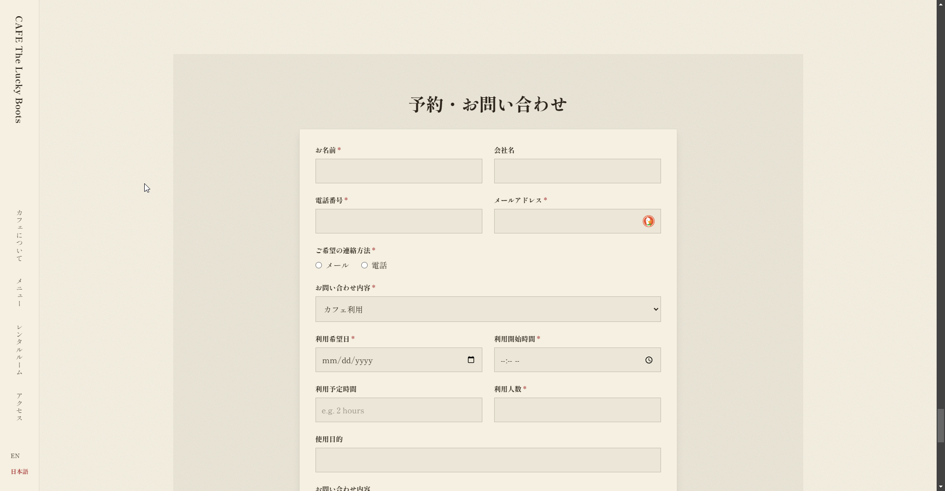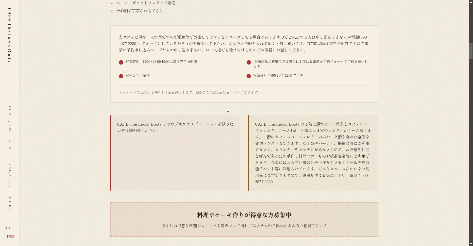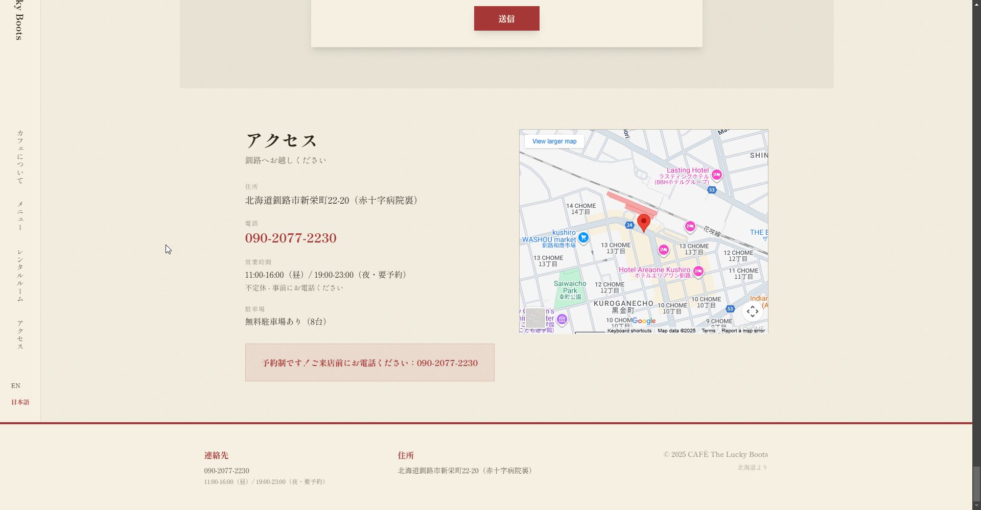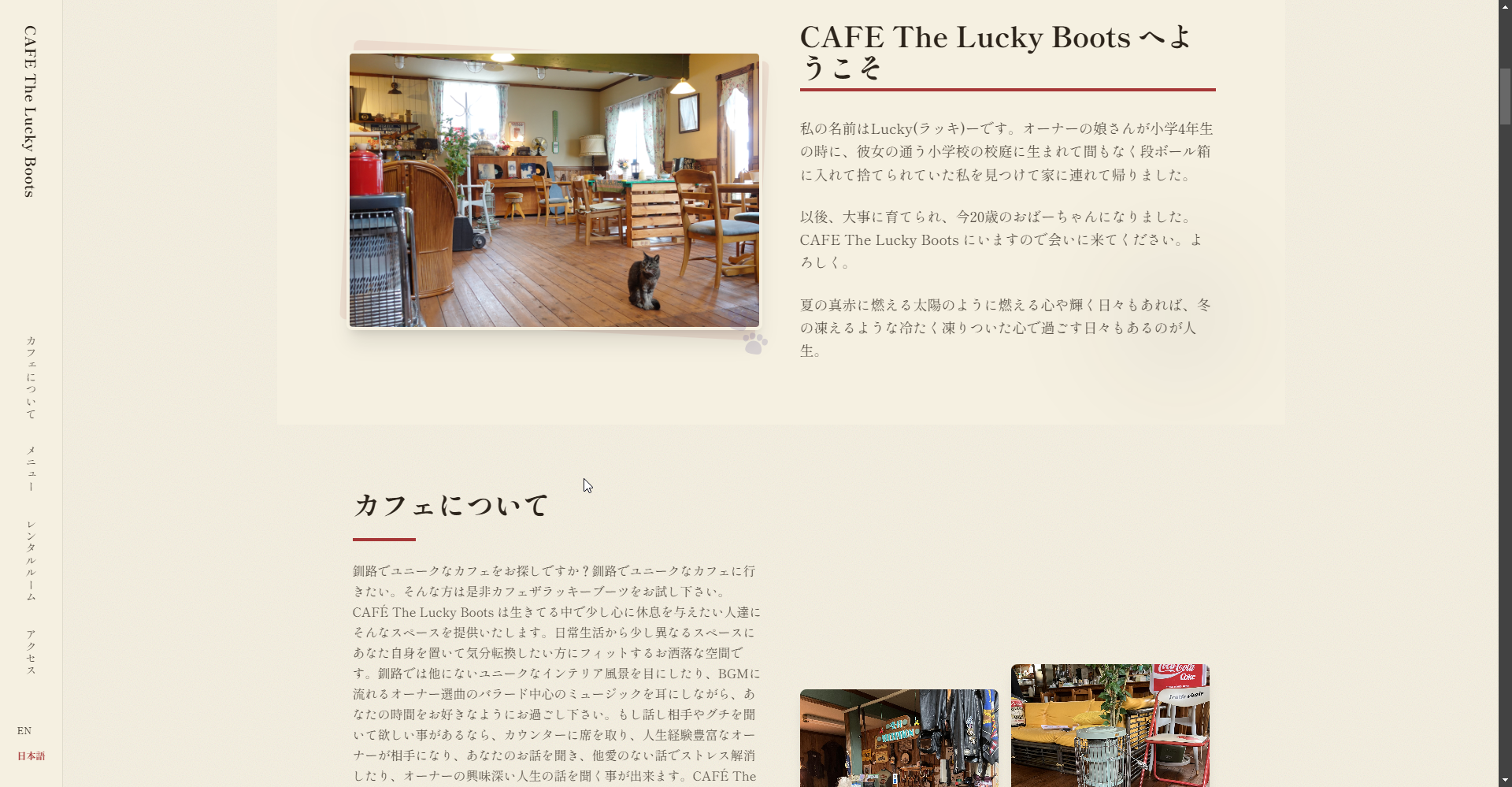 A Japanese website for a cafe called Cafe The Lucky Boots located in Kushiro, Hokkaido. Built with Astro and Tailwind CSS.